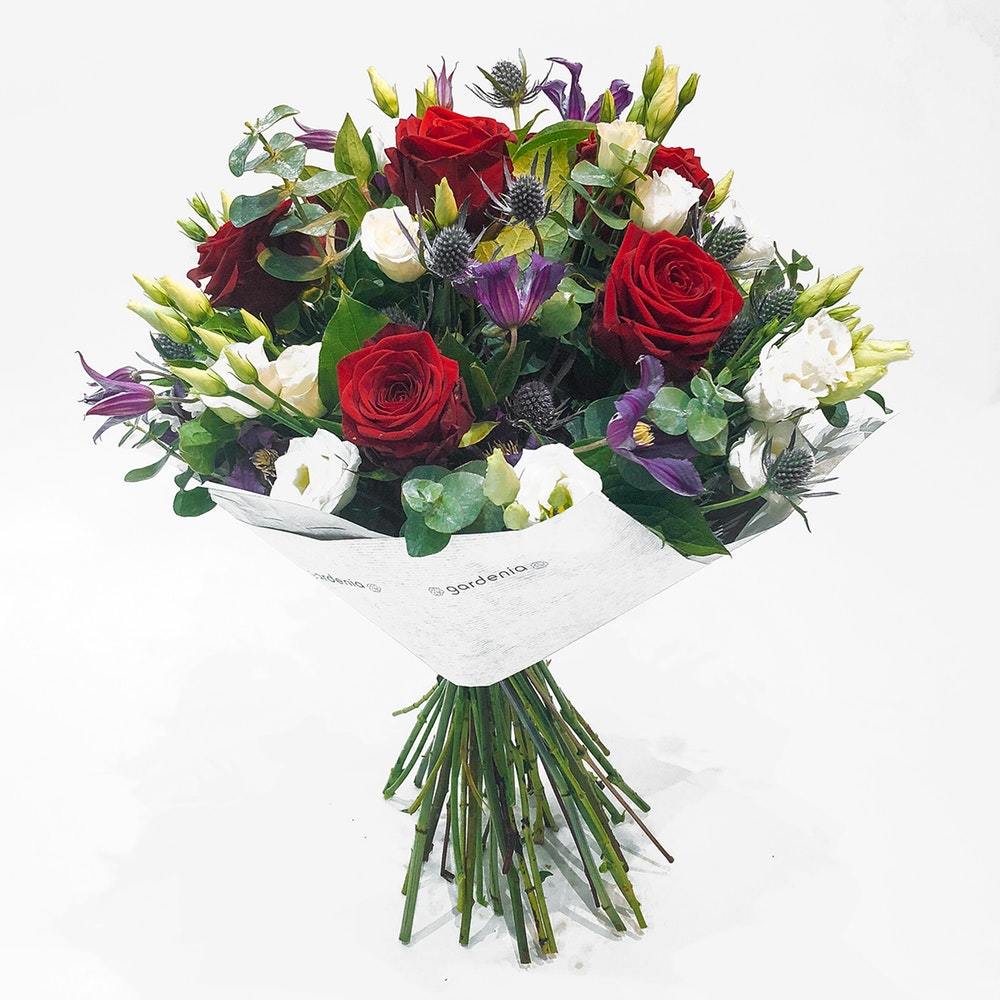 Suitably named “Classic Love”, this hand-tied bouquet of red roses, clematis, lisianthus and thistle stems offers a striking take on the traditional red rose arrangement.